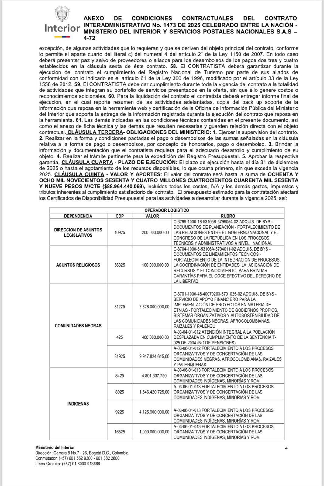 El contrato número 1473 de 2025 tiene como objetivo que la empresa preste servicios logísticos “para llevar a cabo la organización, producción y ejecución de los eventos, encuentros y demás actividades logísticas que se requieren para el desarrollo de funciones, planes, programas y metas del Ministerio del Interior”.