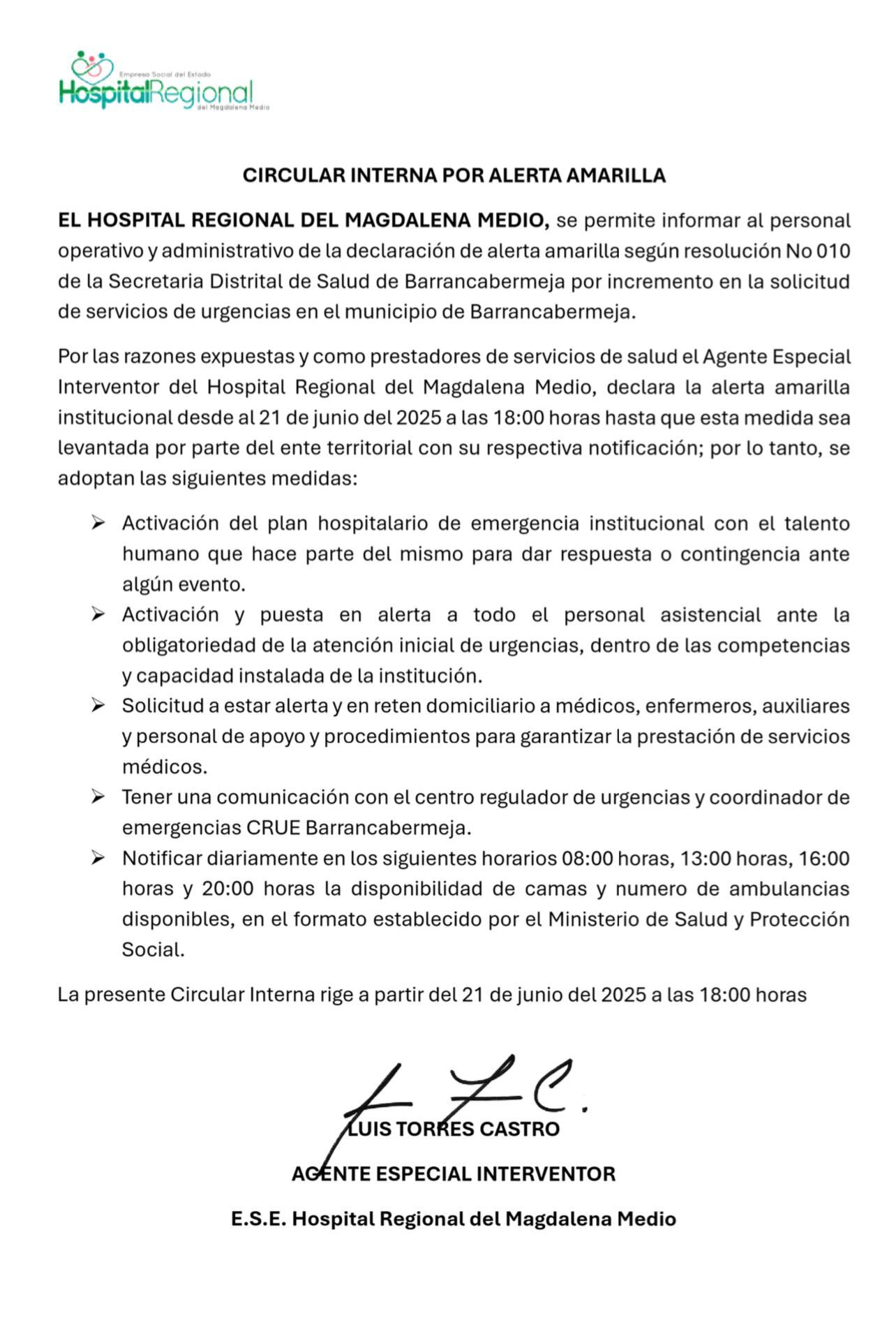 El Hospital Regional del Magdalena Medio confirmó que activó la alerta amarilla institucional, según lo establecido en la Resolución No. 010 emitida por la Secretaría Distrital de Salud. Esto, de acuerdo al comunicado oficial, debido al incremento en la demanda de servicios de urgencias en el municipio de Barrancabermeja.