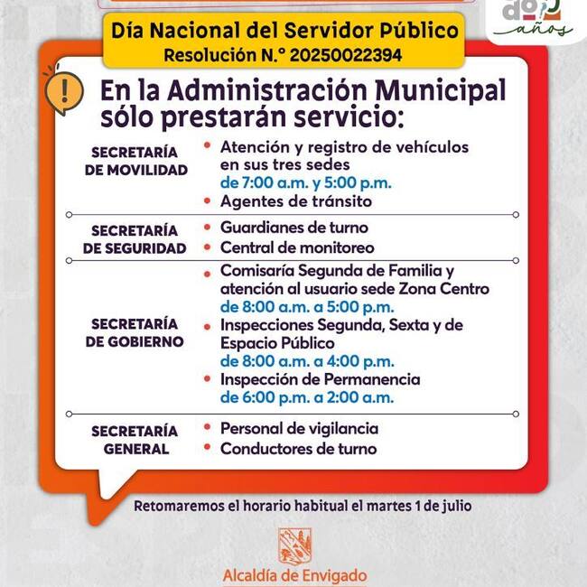 La Alcaldía de Envigado informó que el viernes 27 de junio no prestará atención al público en sus sedes y oficinas administrativas. La medida obedece a una jornada de capacitación virtual en la que participarán todos los funcionarios y empleados públicos, como parte de la conmemoración del Día Nacional del Servidor Público.