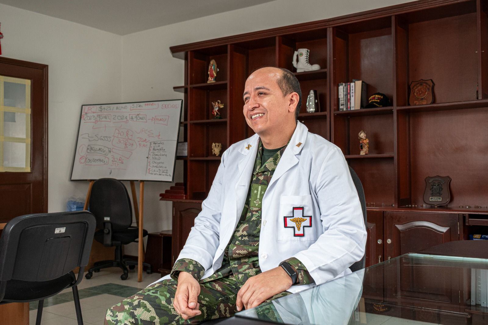 Médico por vocación y militar por convicción: El coronel Becerra define su labor como un doble sacerdocio, que exige entrega absoluta, sacrificio y largas ausencias del hogar. Su uniforme camuflado combina con la bata blanca en hospitales de campaña, quirófanos móviles y bases militares en zonas de alto riesgo.