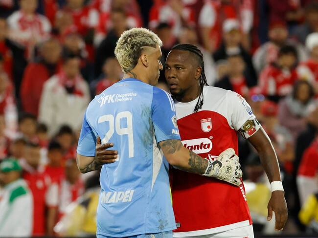 Hugo Rodallega (d) de Santa Fe se saluda con Washington Aguerre de Medellín este martes, durante el partido de ida de la final del la liga colombiana entre Independiente Santa Fe y Deportivo Independiente Medellín en el estadio El Campín en Bogotá (Colombia). EFE/ Mauricio Dueñas Castañeda / Mauricio Dueñas Castañeda (EFE)