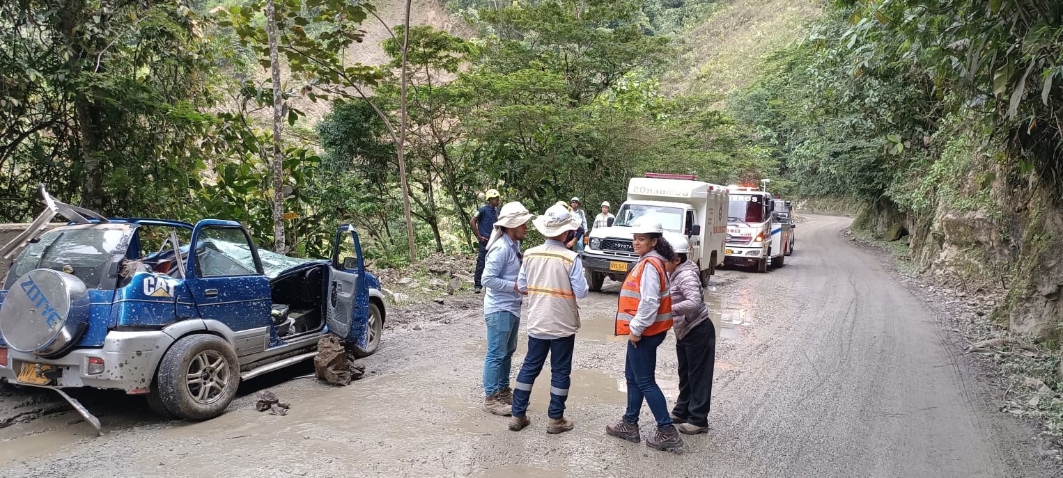 “En el lugar se evidencia que cae material rocoso en la parte alta de la ladera, una ladera bastante prominente, lo cual genera deformación en el vehículo, en la parte del techo, esto generó el atrapamiento de la persona.”