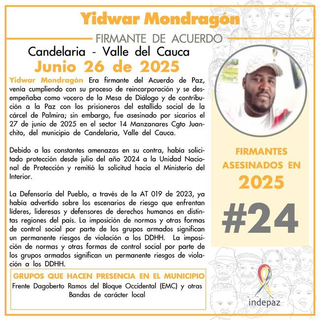 Fue asesinado Yidwar Mondragón de 35 años, firmante del Acuerdo de Paz en el corregimiento de Juanchito, sector 14 de Manzanares del municipio de Candelaria, Valle, cuando hombres armados lo abordaron y le dispararon en múltiples ocasiones.