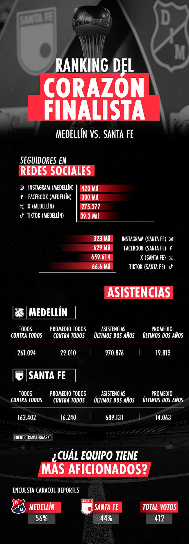 El Ranking del Corazón del Finalista: Medellín Vs. Santa Fe, seguidores, hinchas y asistencias