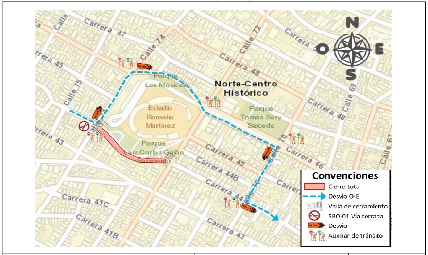 Para los conductores que se movilizan en sentido oeste - este (hacia el Centro) por la carrera 44, la Secretaría indica que deberán girar a la izquierda en la calle 74, luego a la derecha en la carrera 46, y posteriormente girar nuevamente a la derecha en la calle 70, hasta retomar la carrera 44 hacia la izquierda.