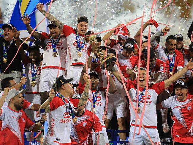 Jugadores de Santa Fe levantan trofeo de la Liga BetPlay 2025. (Photo by JAIME SALDARRIAGA/AFP via Getty Images) / JAIME SALDARRIAGA