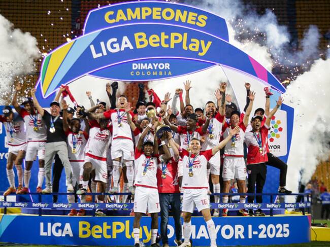 AME9778. MEDELLÍN (COLOMBIA), 29/06/2025.- Jugadores de Santa Fe celebran tras ganar el título de la Liga Colombiana este domingo, en el partido de vuelta de la final del la liga colombiana entre Deportivo Independiente Medellín e Independiente Santa Fe en el estadio Atanasio Girardot en Medellín (Colombia). EFE/ STR / STR (EFE)