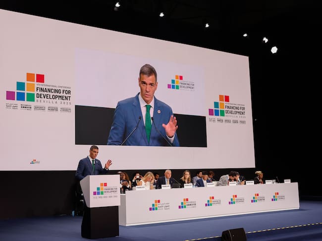 SEVILLA (ESPAÑA), 01/07/2025.- El presidente del gobierno de España Pedro Sánchez durante su intervención en 'Revitalizar la cooperación internacional para el desarrollo', este martes durante la IV Conferencia Internacional para el Desarrollo celebrada en el Palacio de Congresos de Sevilla. EFE/J. Palencia / J. Palencia (EFE)