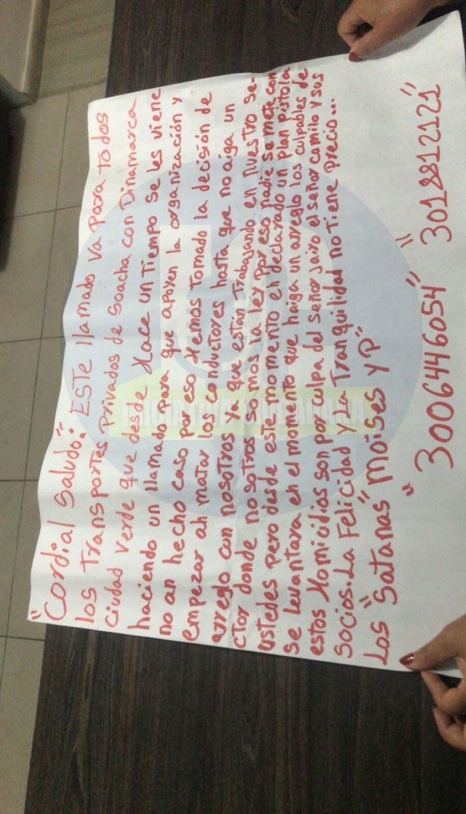 “Este llamado va para todos los transportes privados de Soacha Cundinamarca Ciudad Verde que desde hace tiempo se les viene haciendo un llamado para que apoyen la organización y no han hecho caso. Por eso hemos tomado la decisión de empezar a matar los conductores hasta que no aiga un arreglo con nosotros ya que están trabajando en nuestro sector, donde nosotros somos la ley. Por eso, nadie se mete con ustedes pero desde este momento eh declarado un plan pistola y se levantara en el momento que haiga un arreglo. Los culpables de estos homicidios son por culpa del señor Jairo, el señor Camilo y sus socios. La felicidad y la tranquilidad no tiene precio...”