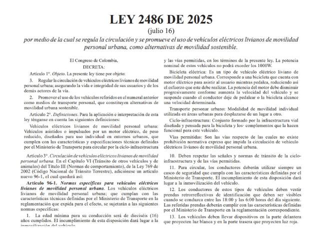 Tras ser radicada y sancionada por el presidente de la república, Gustavo Petro, la Ley 2486 de 2025 confirma que se regula la circulación y además, se promueve el uso de vehículos eléctricos livianos de movilidad personal urbana, como alternativas de movilidad sostenible; entre los aspectos más importantes, destacan: