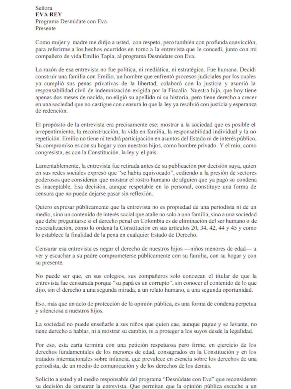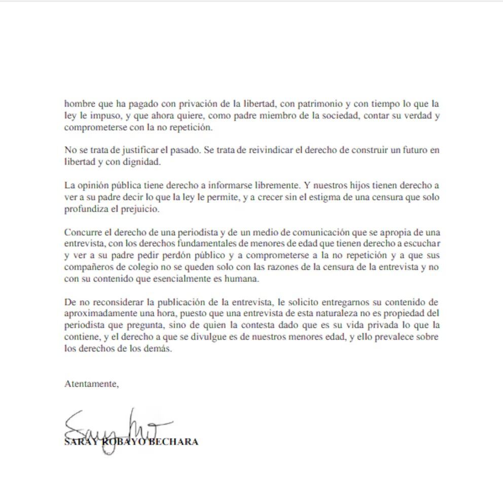 Finalmente, Robayo indicó que, de no publicarse la entrevista completa, solicita que el contenido de ‘aproximadamente una hora’ le sea entregado, argumentando que al tratarse de su vida privada, el material no pertenece exclusivamente a la periodista sino también a quien responde las preguntas.