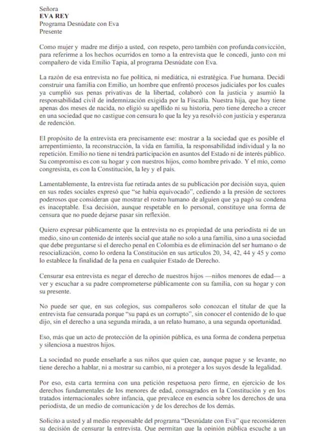 La congresista reiteró su solicitud a la periodista a través de una carta en la que pide la publicación completa de la entrevista.