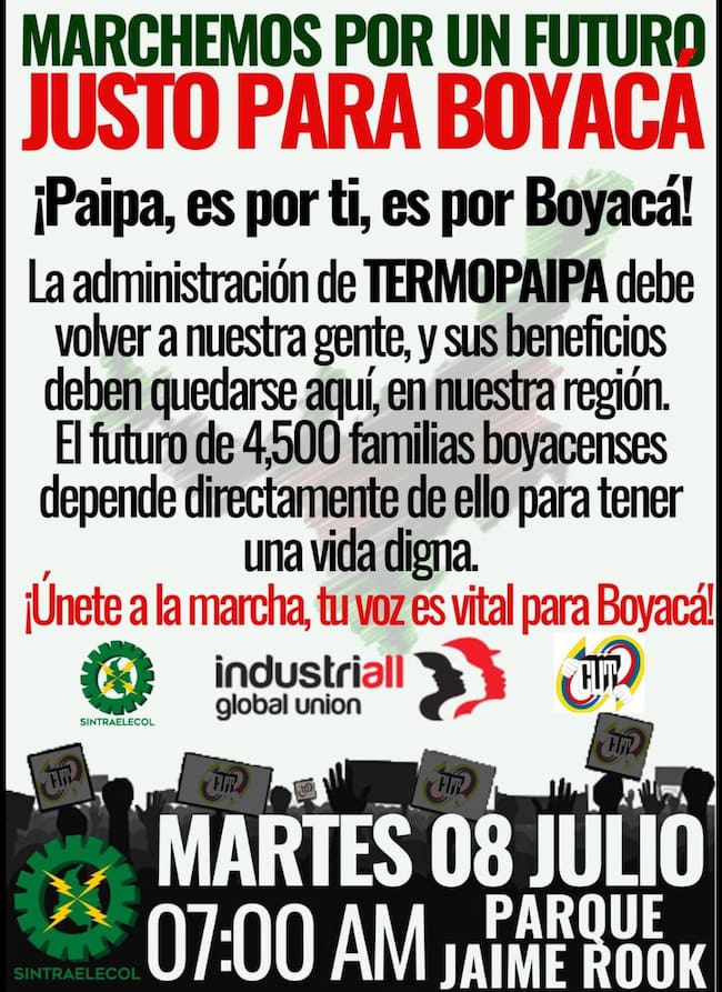 “Pues hoy tenemos definido que vamos a entrar a paro indefinido, pero de acuerdo a los avances que se realicen y a los acuerdos que lleguemos a tener con el Gobierno Nacional ese mismo 8 de julio, hemos dado nuestra palabra que suspenderemos la actividad, porque finalmente lo que buscamos es que se cree una mesa de diálogo con el Ministerio de Hacienda y Crédito Público, con el Ministerio de Minas y Energía, y por supuesto, con los representantes de servicios públicos para que vengan a Termopaipa y evalúen realmente en qué están invertidos los recursos económicos”, indicó el presidente de Sintraelecol Paipa.