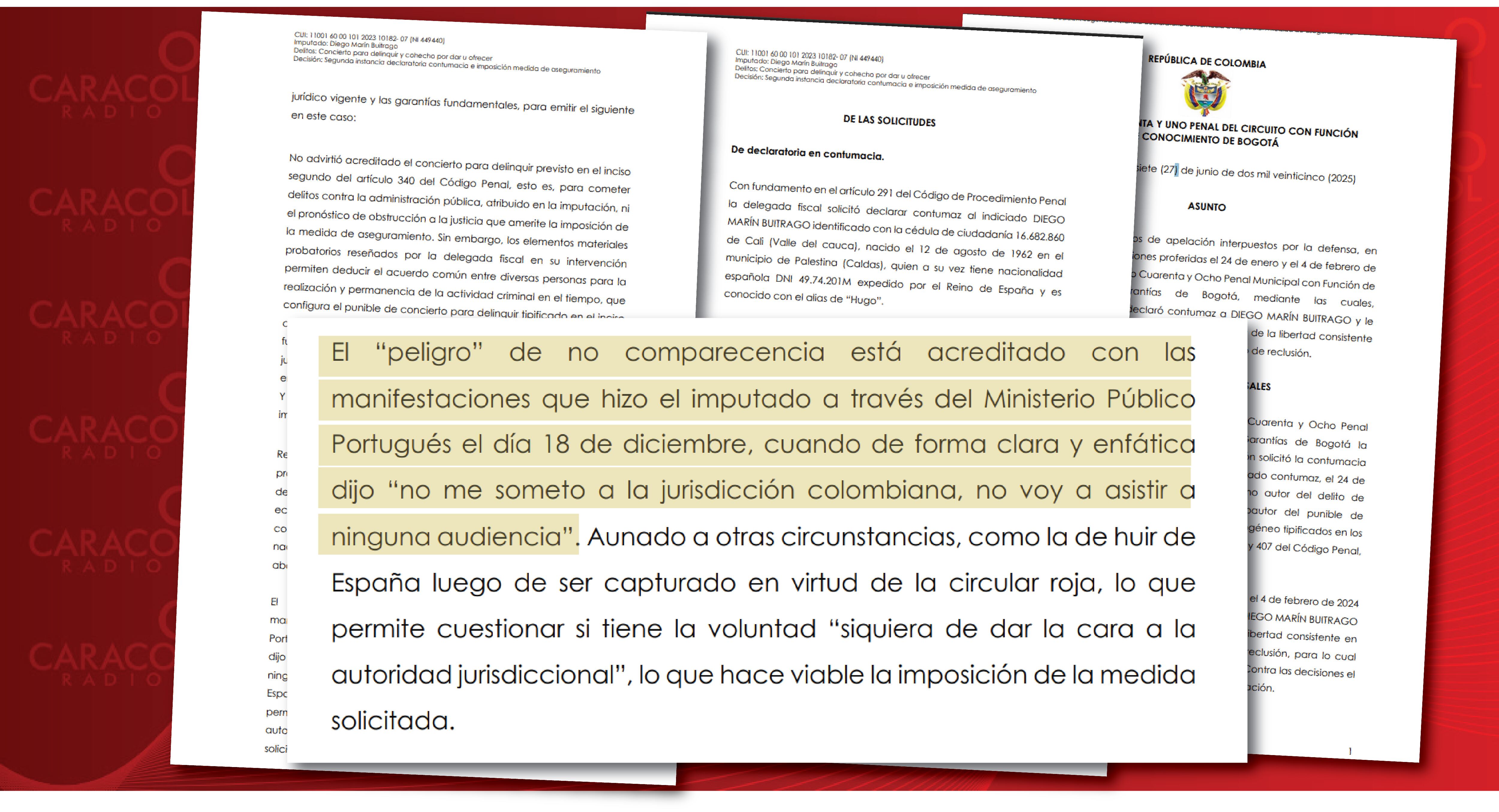 “La anterior reseña demuestra que por parte de la Fiscalía General de la Nación se han agotado todos los medios para lograr la comparecencia del indiciado DIEGO MARÍN BUITRAGO, quien se niega a participar en las audiencias preliminares a sabiendas del requerimiento judicial, lo que refleja su rebeldía y renuencia a comparecer ante la administración de justicia”.