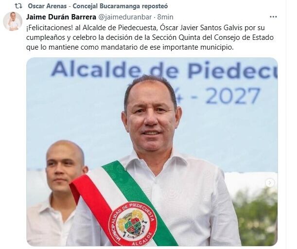 A pesar de que aún no se ha corrido traslado a las partes para conocer el fallo emitido en segunda instancia, a través de su cuenta de X el senador Jaime Barrera Durán celebró la decisión del Consejo de Estado de ratificar al mandatario de los piedecuestanos.
