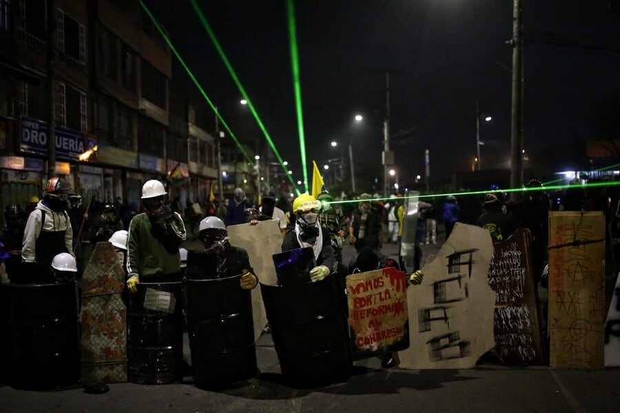 La policía antidisturbios de Colombia (UNDMO) se enfrenta a manifestantes en Bogotá. (Foto de: Cristian Bayona/Long Visual Press/Universal Images Group vía Getty Images) / Long Visual Press