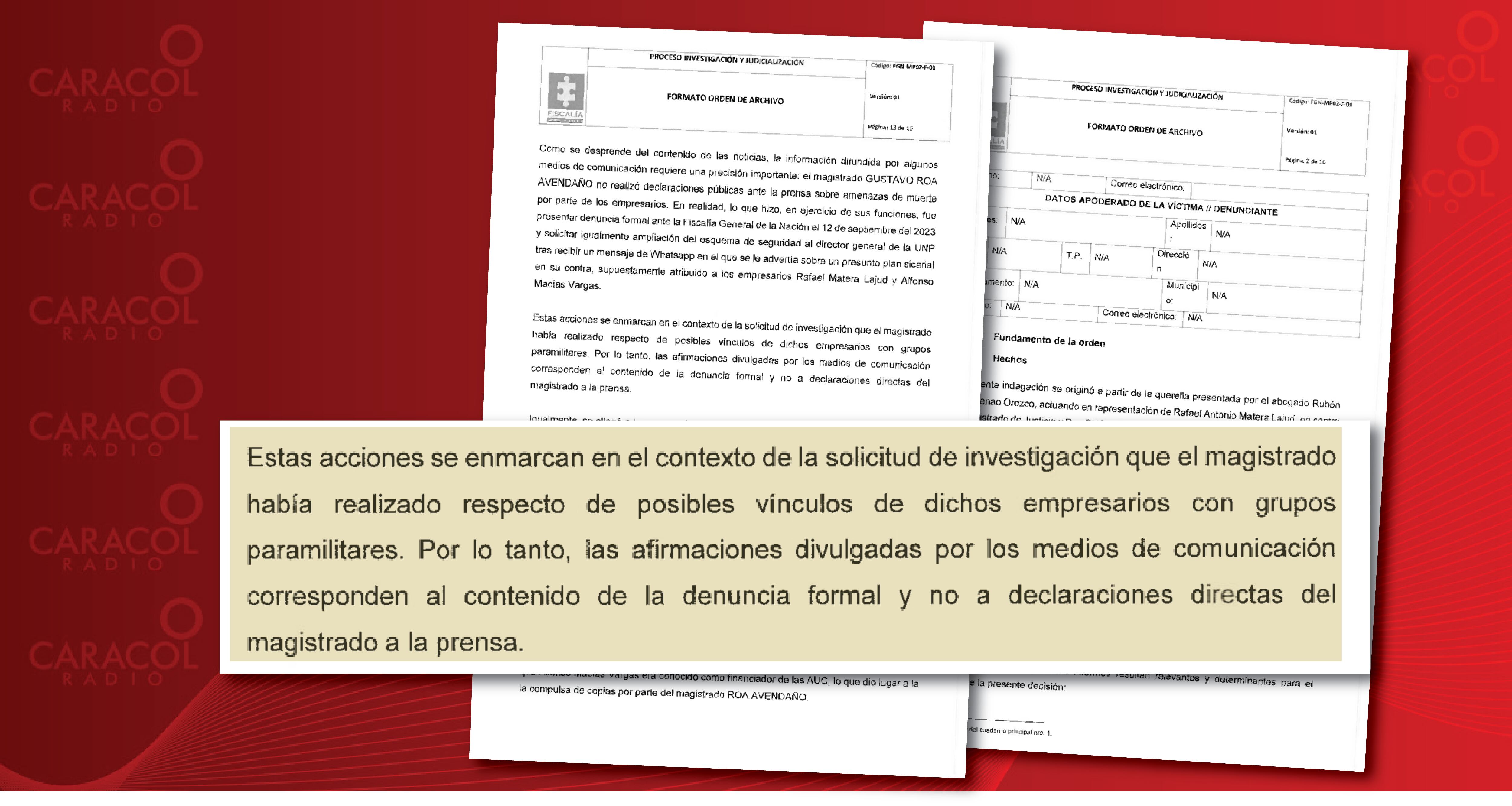 Al analizar el caso, la Fiscalía determinó que el magistrado nunca realizó declaraciones públicas ante la prensa sobre las amenazas de muerte como lo alegó el abogado de los empresarios.