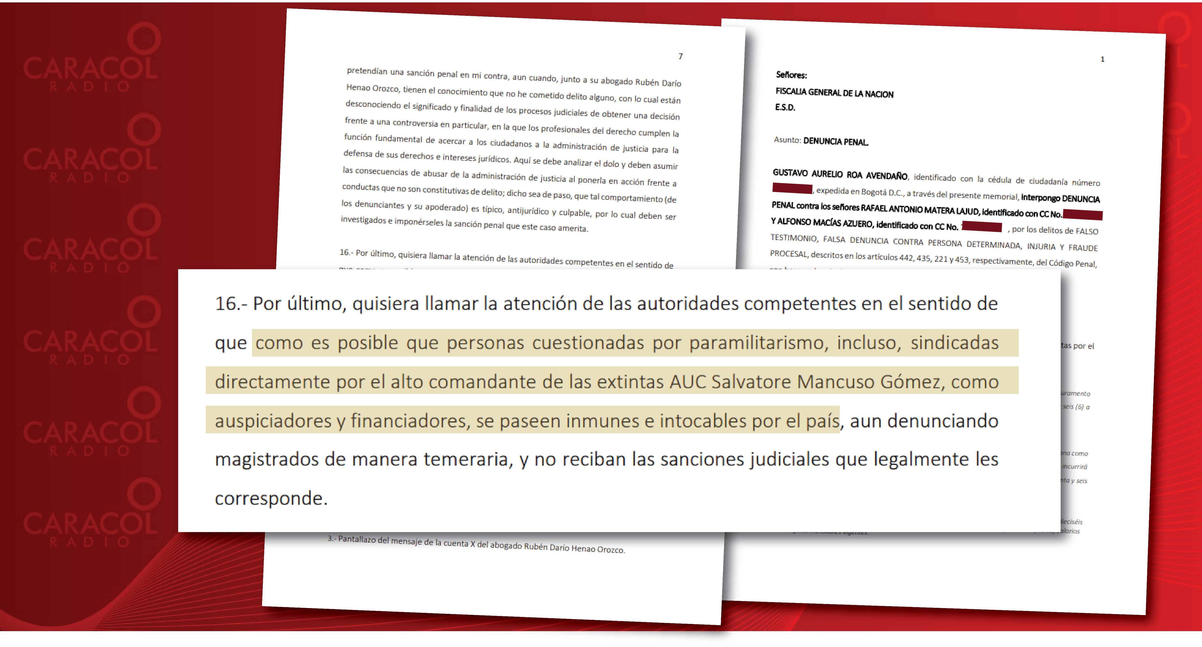 Ahora, el magistrado de Justicia y Paz, Gustavo Roa Avendaño, denunció al empresario Rafael Antonio Matera Lajud, salpicado por Salvatore Mancuso como supuesto financiador y Auspiciador de las extintas AUC, y al empresario Alfonso Macías Azuero por los delitos de falso testimonio, falsa denuncia, injuria y fraude procesal.