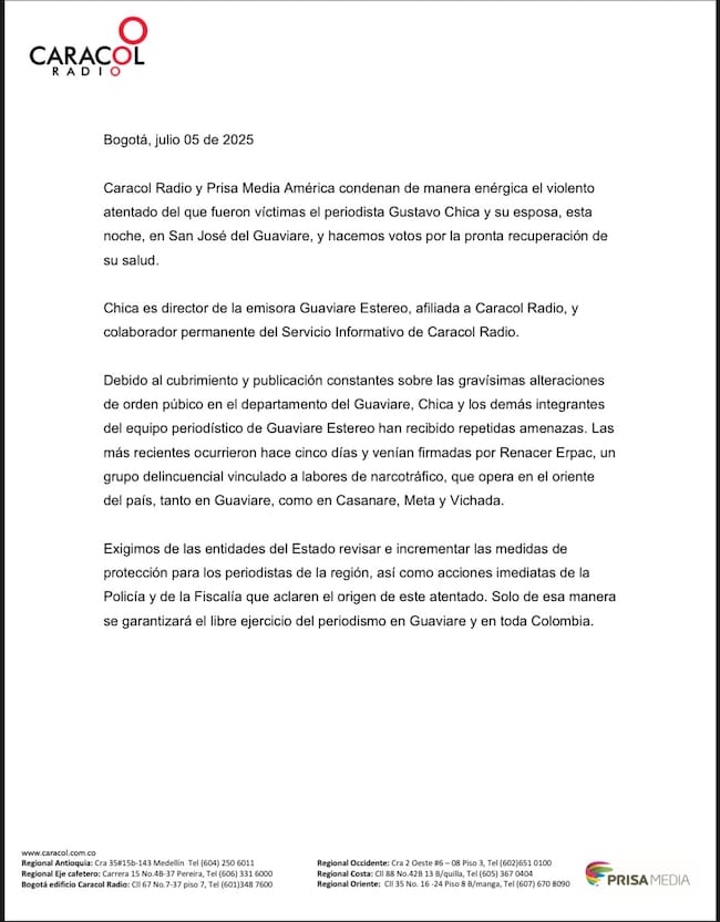 Caracol Radio y Prisa Media América condenan de manera enérgica el violento atentado del que fueron víctimas el periodista Gustavo Chica y su esposa, esta noche, en San José del Guaviare, y hacemos votos por la pronta recuperación de su salud.