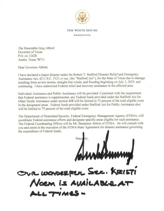 “La Administración Trump continúa trabajando estrechamente con los líderes estatales y locales. La Secretaria de Seguridad Nacional, Kristi Noem, estuvo ayer en el terreno con el Gobernador Greg Abbott, quien trabaja arduamente para ayudar a la gente de su gran estado”, agregó el mandatario.