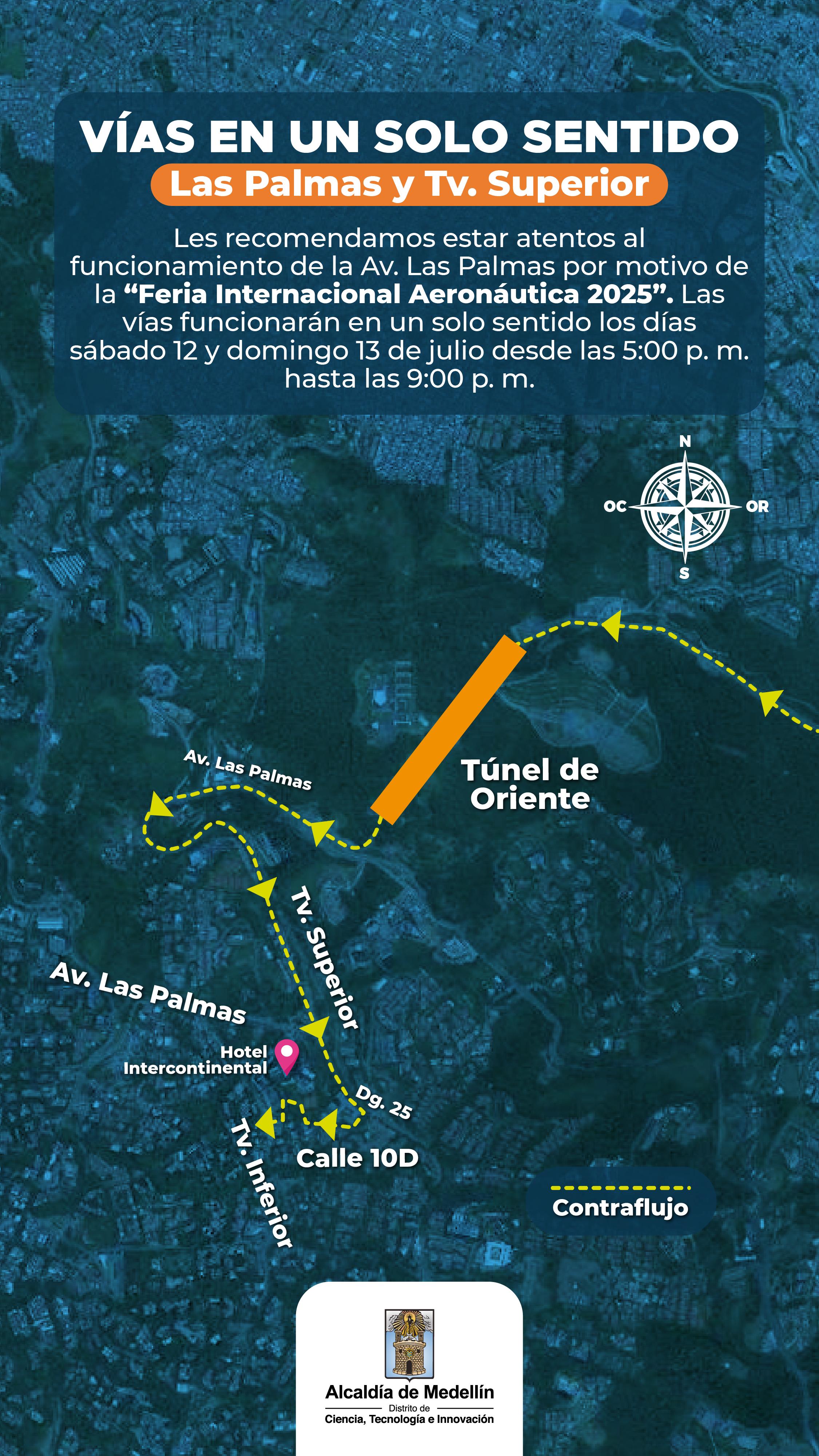 Las vías que operarán con normalidad serán, Variante Palmas – Aeropuerto; Túnel de Oriente – Aeropuerto; Autopista Guarne – Aeropuerto y Llanogrande – Aeropuerto. Además, se habilitarán el reversible en “Hatoviejo” y el giro derecho en “San Carbón”.