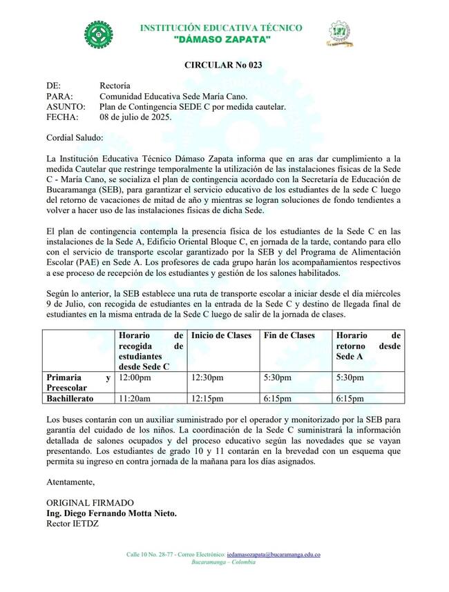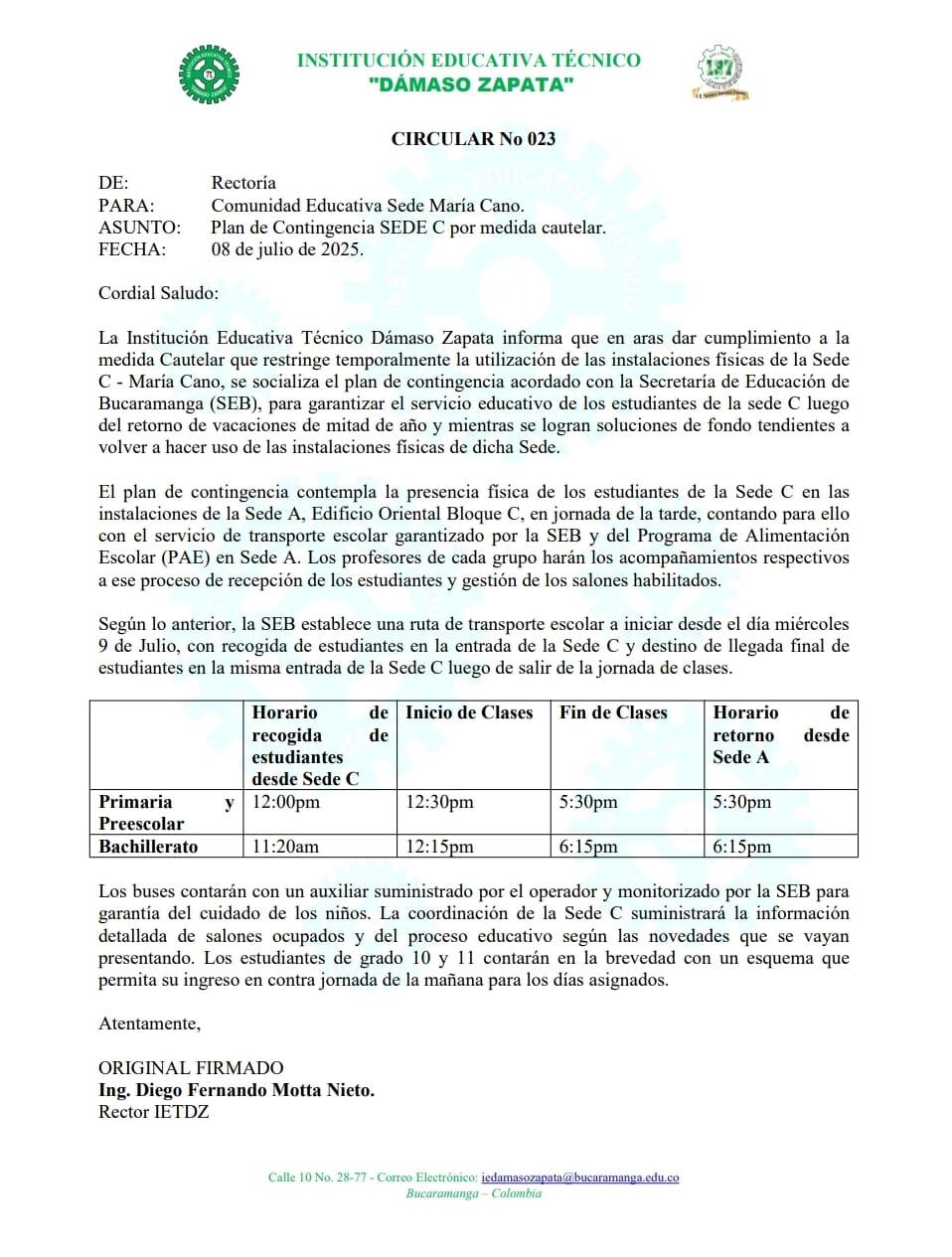 Teniendo en cuenta que se confirma el desalojo de esta sede C de la Institución Educativa Técnico Dámaso Zapata, el rector confirmó que los estudiantes serán traslados a la sede principal y que, desde la Secretaría de Educación de Bucaramanga, garantizarán el transporte de los estudiantes como medida de contingencia.