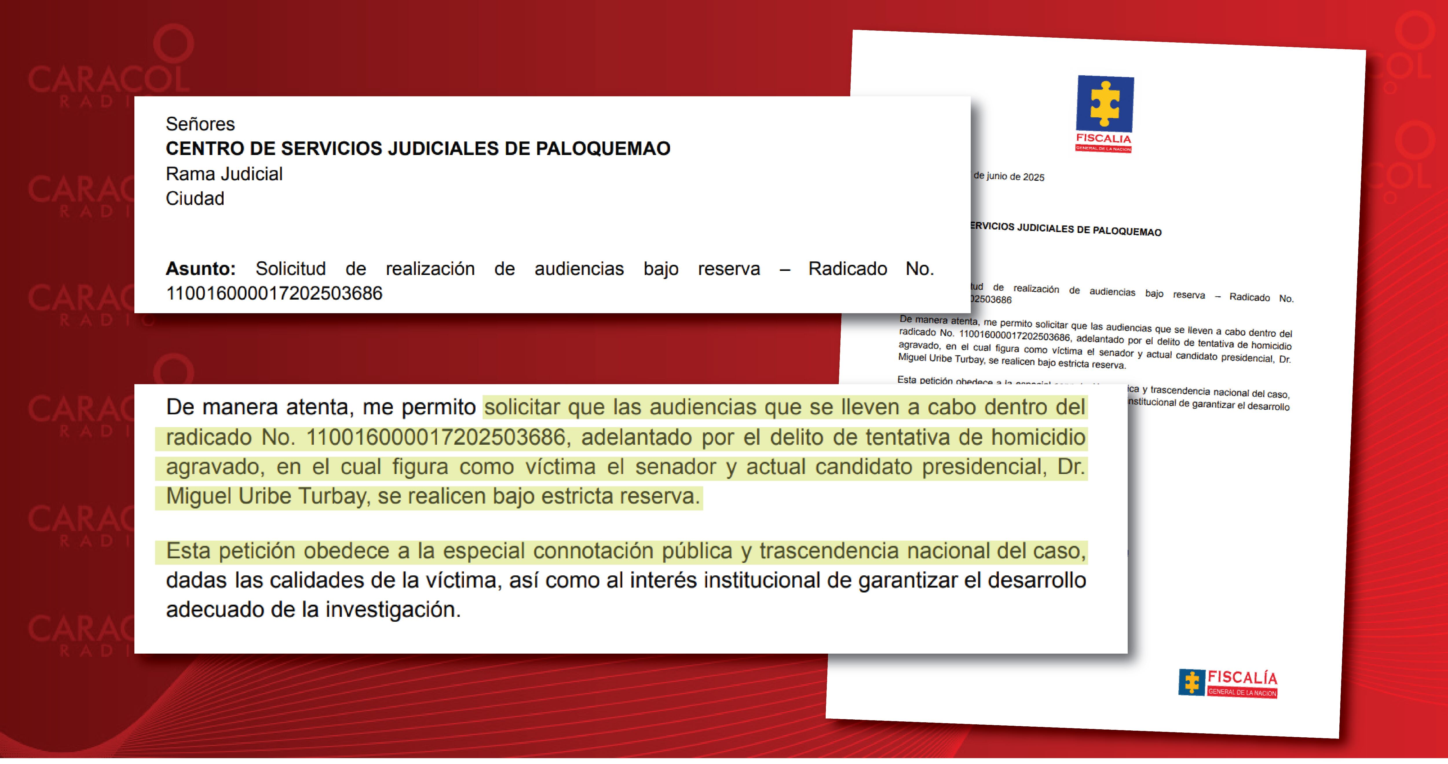 “Solicitar que las audiencias que se lleven a cabo dentro del radicado No. 110016000017202503686, adelantado por el delito de tentativa de homicidio agravado, en el cual figura como víctima el senador y actual candidato presidencial, Dr. Miguel Uribe Turbay, se realicen bajo estricta reserva”.