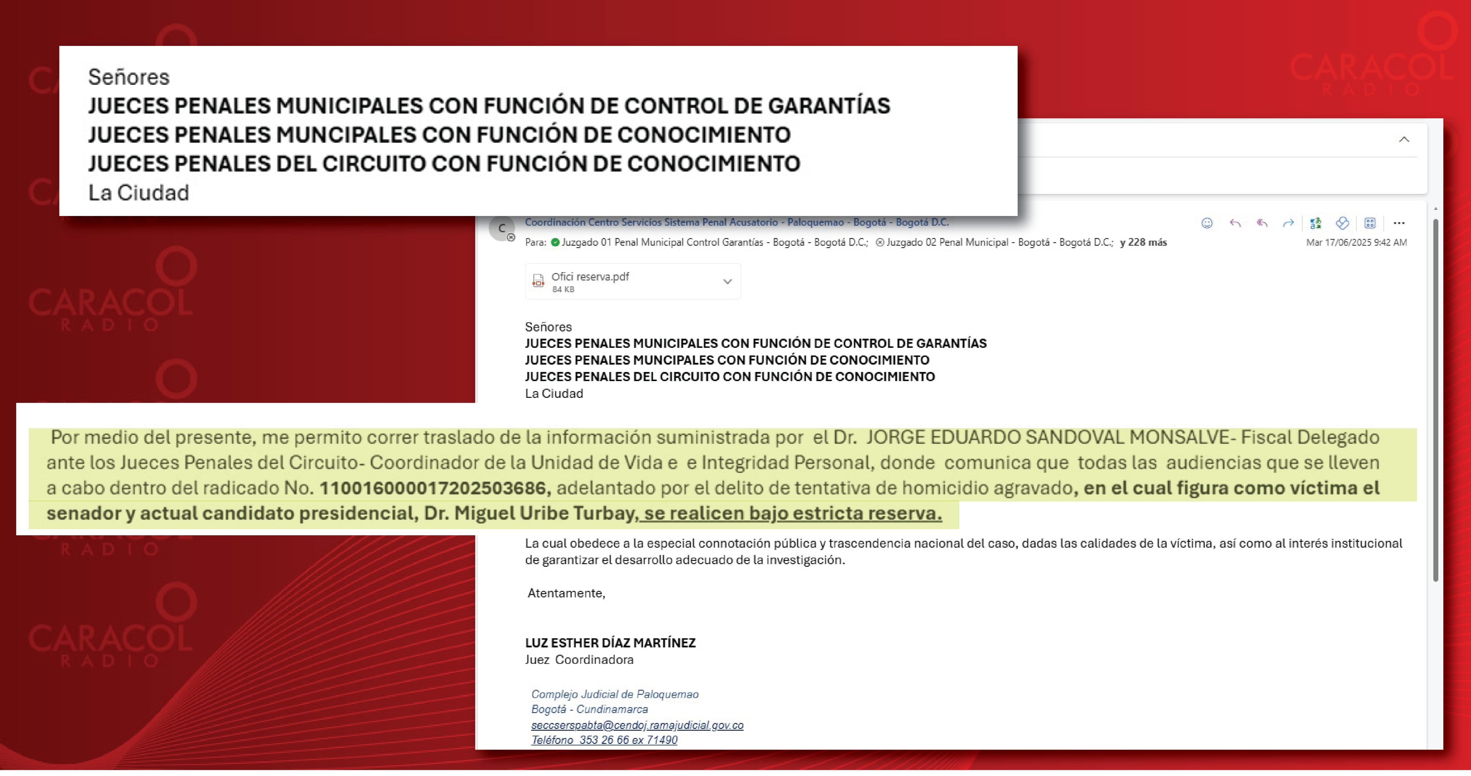 Caracol Radio conoció dos cartas de la Fiscalía y un correo del Centro de Servicios del complejo judicial de Paloquemao que ordenan la reserva absoluta y poner un cerrojo a todas las actuaciones que se hagan dentro del expediente que cursa en contra de los implicados en el atentado contra el senador Miguel Uribe Turbay.
