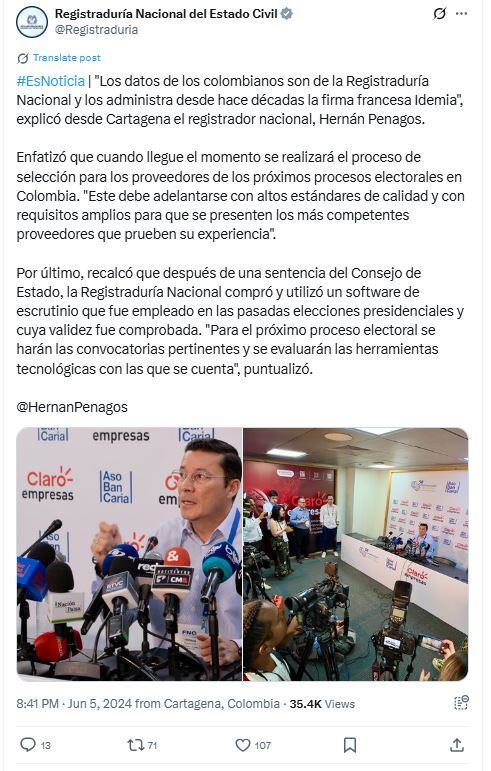 Pero queda además otra pregunta: ¿podrá seguir desconfiando el presidente Petro de la Registraduría Nacional y su labor electoral cuando desde hace décadas es justamente IDEMIA (ahora IN Groupe) la firma que administra y garantiza la seguridad de los datos de los colombianos según confirmó hace un año el mismo registrador nacional Hernán Penagos?