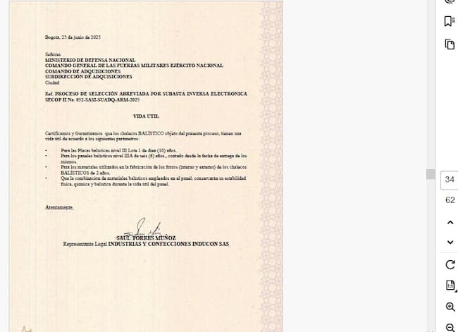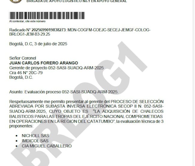 Consultado el Ejército sobre estas presuntas irregularidades, aseguraron que el proceso licitatorio apenas inició y se están evaluando la documentación de los tres oferentes que se presentaron, sin embargo, con base en el cronograma del proceso, en poder de este medio, la adjudicación se daría entre el 11 y 15 de julio y el Ejército Nacional podría adjudicar el contrato a un proponente que presentó su oferta con documentación de una empresa que no ha cumplido en un proceso previo, y que además depende de componentes importados para cubrir requisitos técnicos. (Ver documentos)