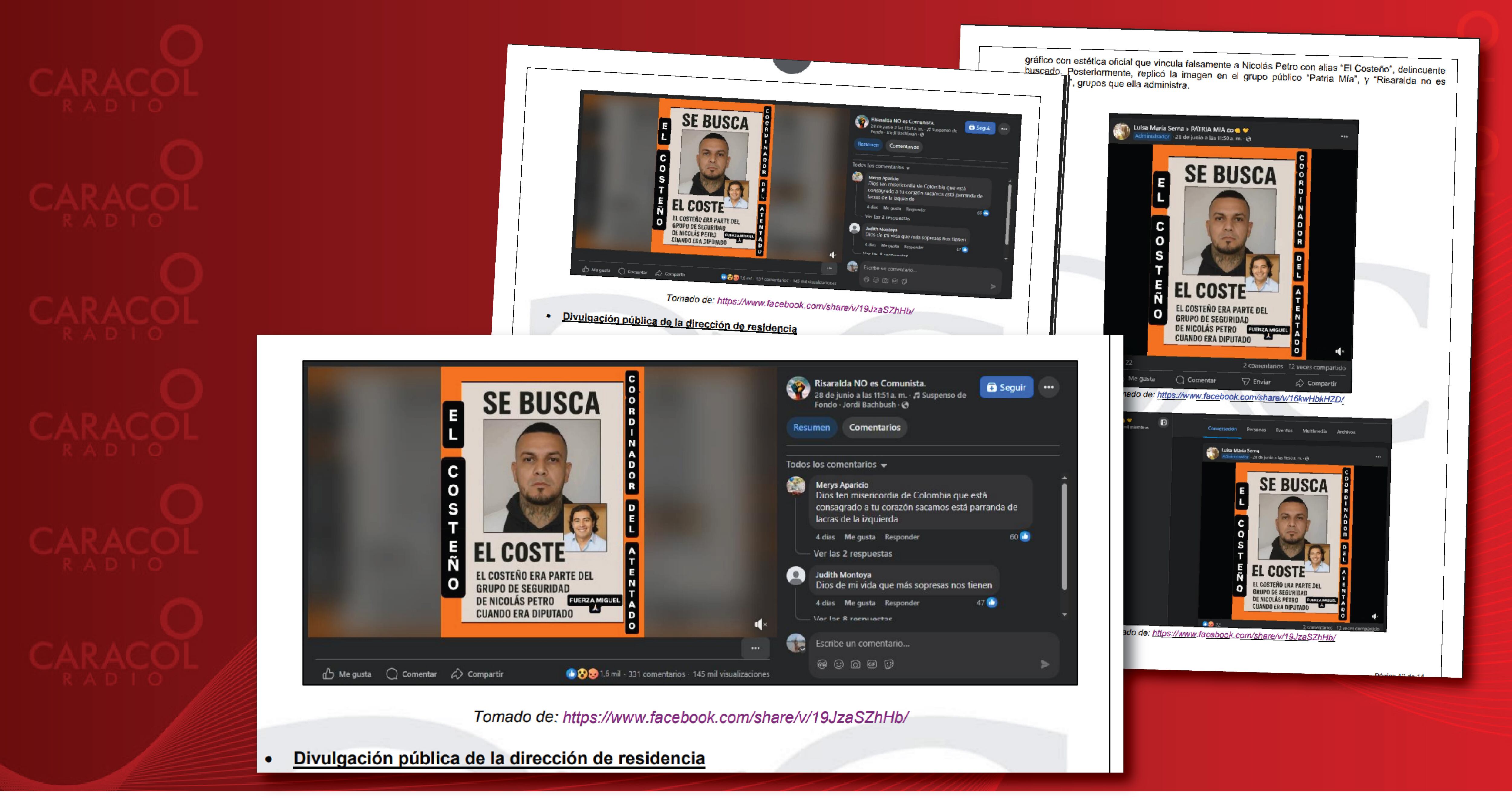 “Cuando uno observa eso, lo que trata de instaurar esa señora Serna, y ese grupo ‘Colombia Patria mía’, es una narrativa para enviar un mensaje de que Nicolás tiene relación con ese atentado tan terrible, o peor aún, que el esquema presidencial utiliza esa clase de personas dentro de la protección o de la UNP, algo que es absolutamente falso y que además de todo promueve una violencia simbólica enorme, algo que no se puede permitir. Fuera de eso hay una manipulación frente a ese letrero de “se busca” porque es un letrero oficial y se ha difundido en las redes (…) Todo eso lo único que hace es abrir una puerta e incitar a que haya agresiones y ataques a Nicolás”.