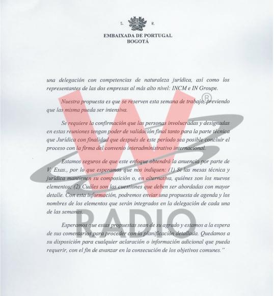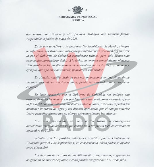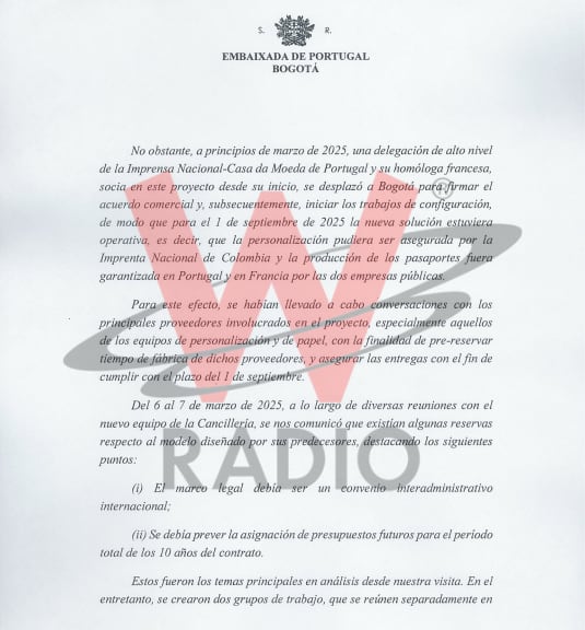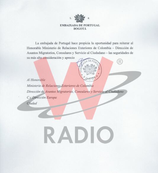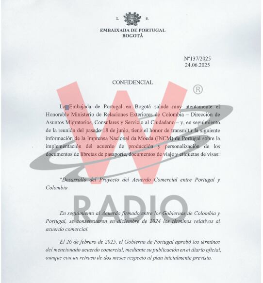 El director de La W, Julio Sánchez Cristo, dio a conocer un nuevo documento de la Embajada de Portugal que le envió al Ministerio de Relaciones Exteriores de Colombia, en donde se habla de la implementación del acuerdo de producción y personalización de los documentos de libretas de pasaportes, documentos de viaje y etiquetas de visa.