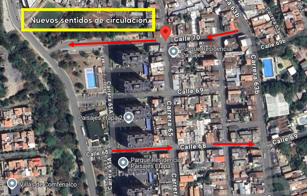 El análisis técnico evidenció un mayor uso de la calle 70 para ingresar al sector de Paisajes y de la calle 68 como vía de salida hacia la carrera 65B. A pesar de su diferente clasificación en el Plan de Ordenamiento Territorial, ambas comparten características físicas similares.