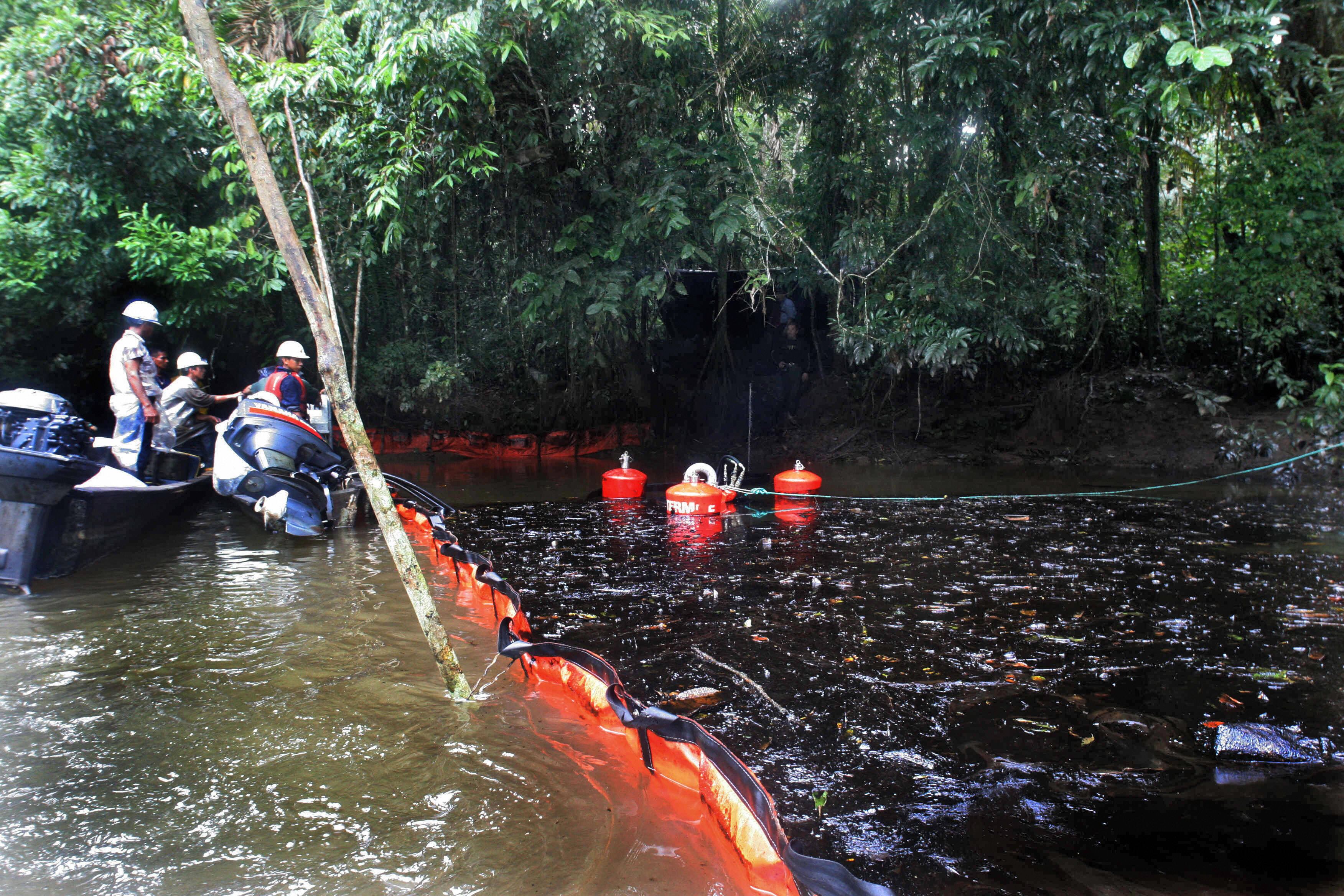 Trabajos de contención tras un derrame de crudo en el río Chico, en Ecuador. (Foto: RODRIGO BUENDIA/AFP via Getty Images) / RODRIGO BUENDIA
