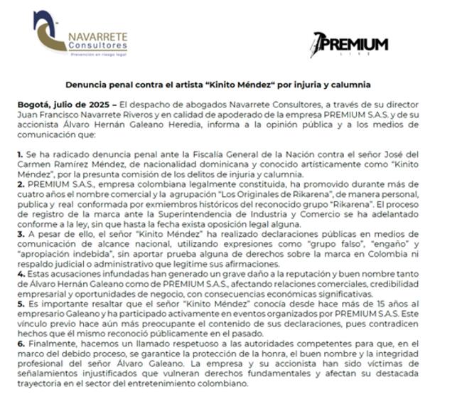 Según el despacho de abogados Navarrete Consultores, Méndez habría realizado declaraciones públicas en medios nacionales calificando como “grupo falso” y “engaño” a la agrupación “Los Originales de Rikarena”, promovida legalmente por PREMIUM S.A.S. desde hace más de cuatro años. La empresa asegura que el proceso de registro de la marca se ha hecho conforme a la ley y sin oposición legal.