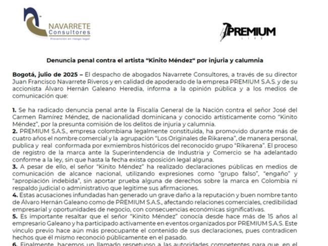 Según el despacho de abogados Navarrete Consultores, Méndez habría realizado declaraciones públicas en medios nacionales calificando como “grupo falso” y “engaño” a la agrupación “Los Originales de Rikarena”, promovida legalmente por PREMIUM S.A.S. desde hace más de cuatro años. La empresa asegura que el proceso de registro de la marca se ha hecho conforme a la ley y sin oposición legal.