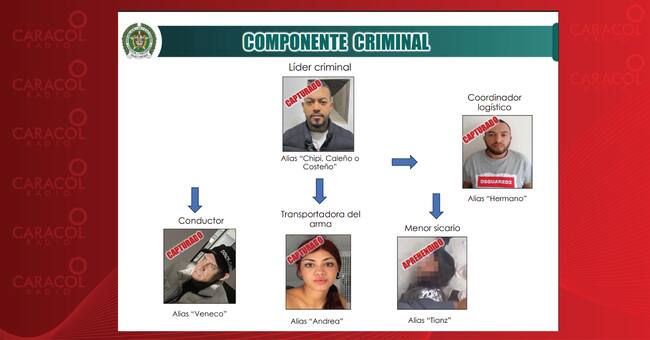 El sicario menor de edad; Carlos Eduardo Mora González, conductor del spark gris; Catherine Andrea Martínez alias ‘Gabriela’, William Fernando Gonzalez Cruz, el “campanero”; y Elder José Arteaga, alias ‘El Costeño’.