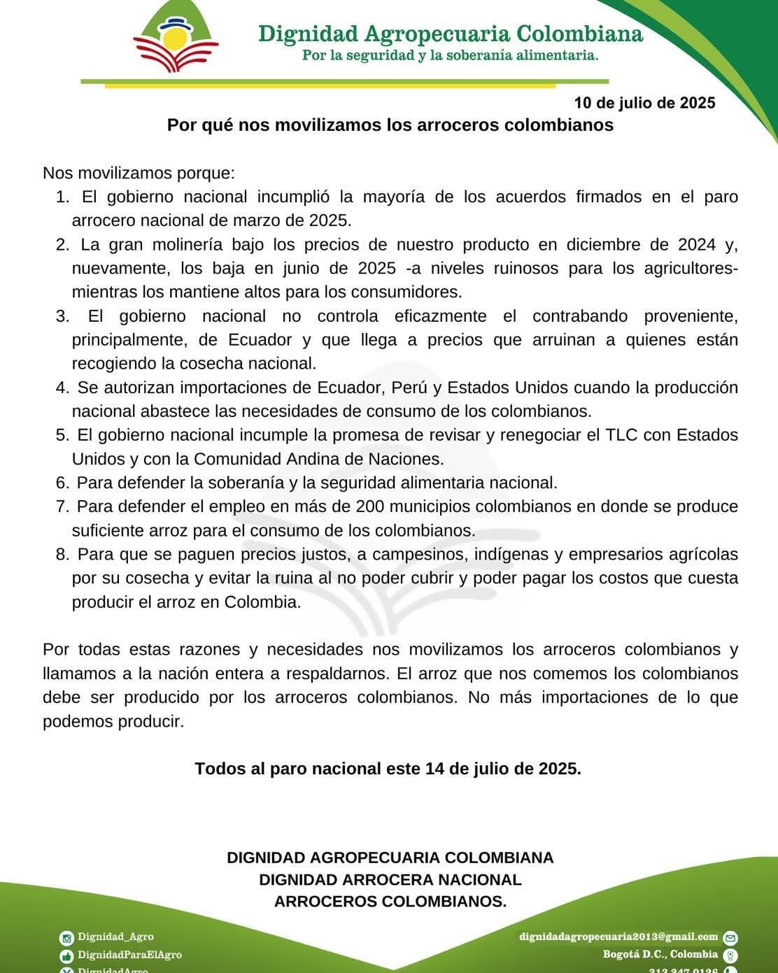 Dignidad Agropecuaria de Colombia, envió un comunicado detallando el por qué de esta movilización: