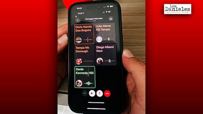 La imagen muestra que bajo el título “Portugal Interview” Diego Cadena, desde un teléfono identificado como “Diego Miami New” participa en una conversación simultánea con cuatro personas: