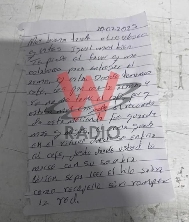 “Te pido el favor que me colabores para entregar el arma que está donde tomamos café con pan con ‘La Araña’ y que yo no me tomé el café porque estaba muy cargado”, se lee en la primera parte de la carta.