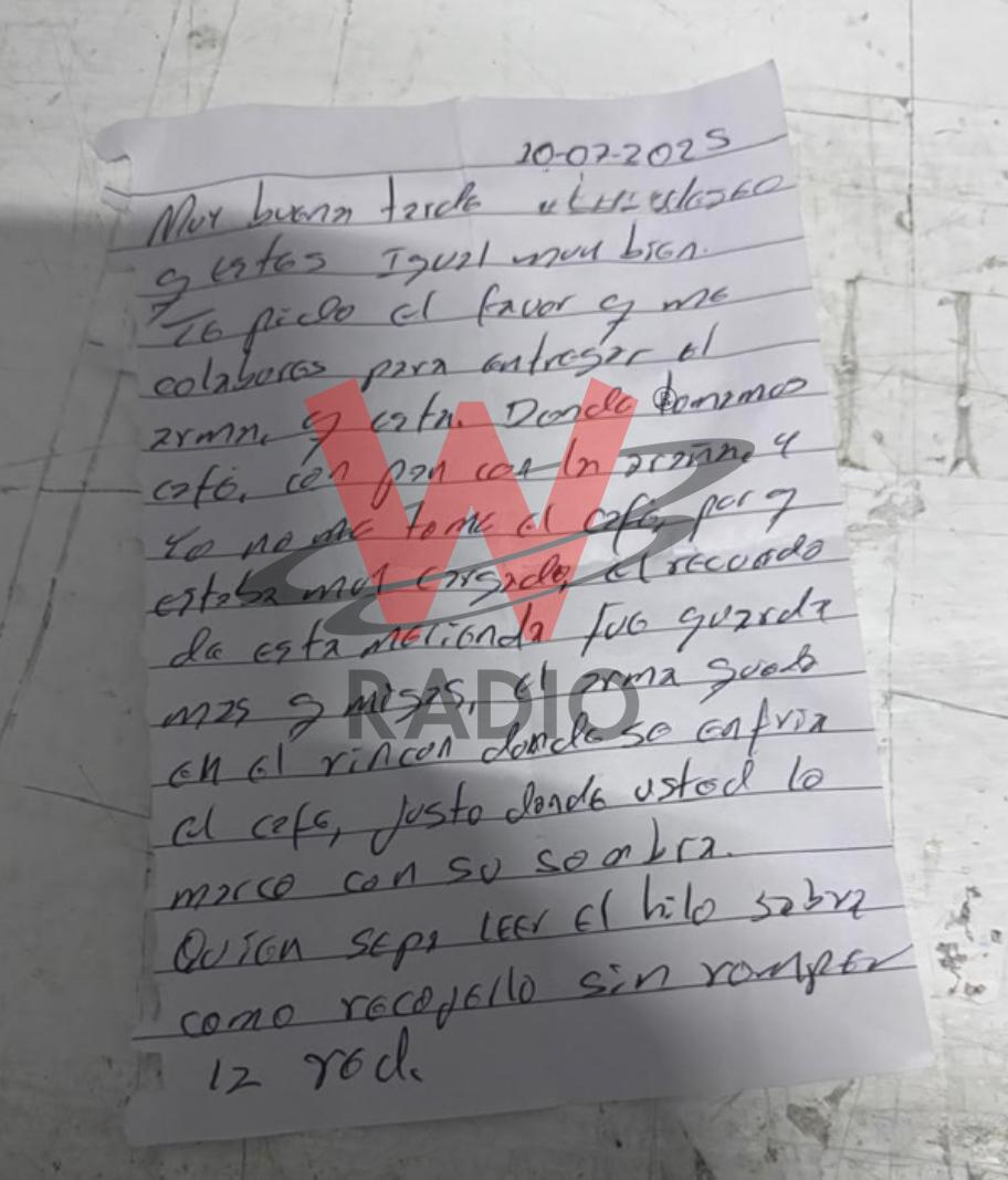“Te pido el favor que me colabores para entregar el arma que está donde tomamos café con pan con ‘La Araña’ y que yo no me tomé el café porque estaba muy cargado”, se lee en la primera parte de la carta.