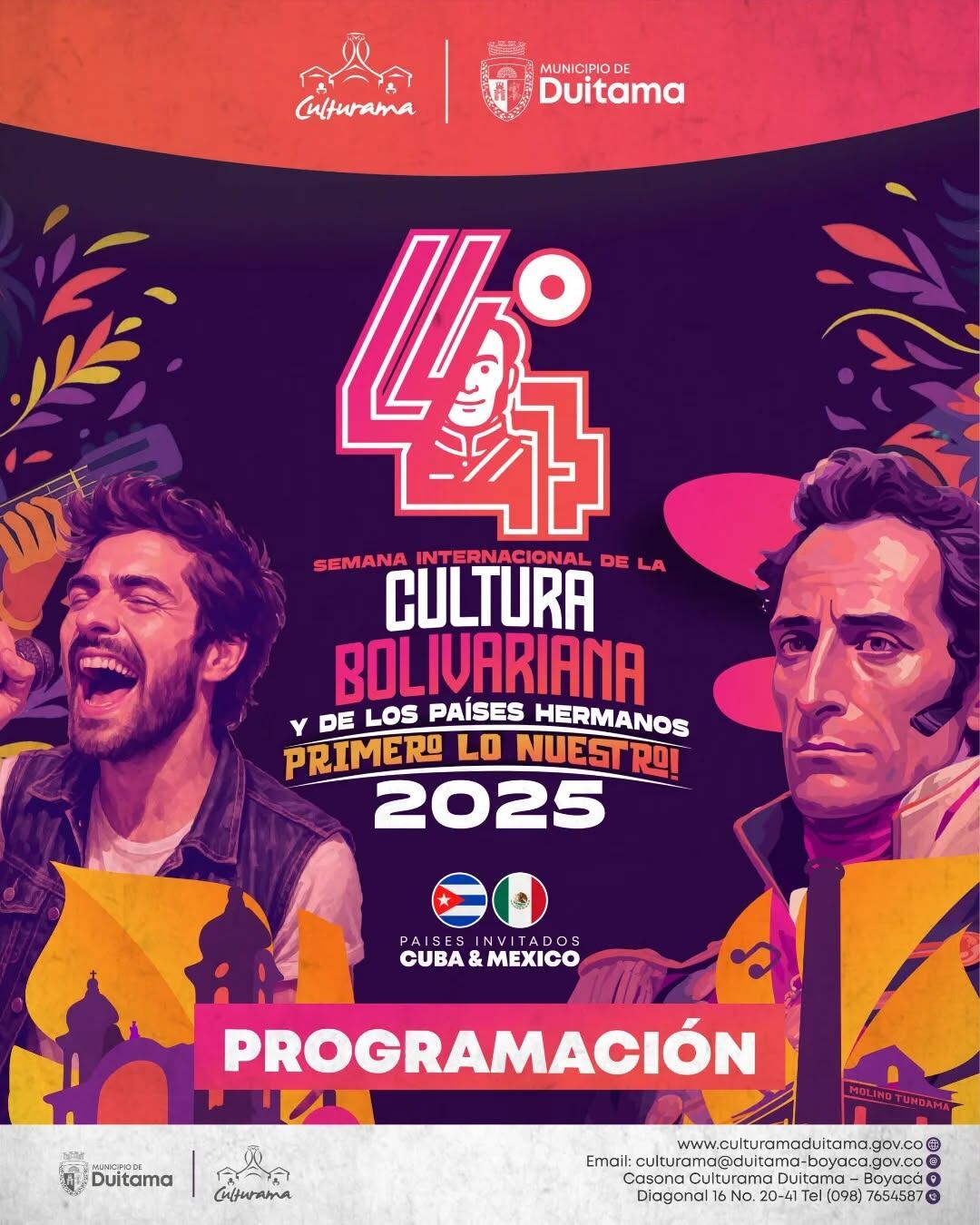 Del 20 al 27 de julio, Duitama vivirá la edición número 44 de la Semana Internacional de la Cultura Bolivariana, una celebración que exalta las raíces, tradiciones y expresiones artísticas del municipio y de países invitados. En esta ocasión, México y Cuba participarán como invitados especiales, con presentaciones culturales, talleres y actos artísticos durante toda la semana.