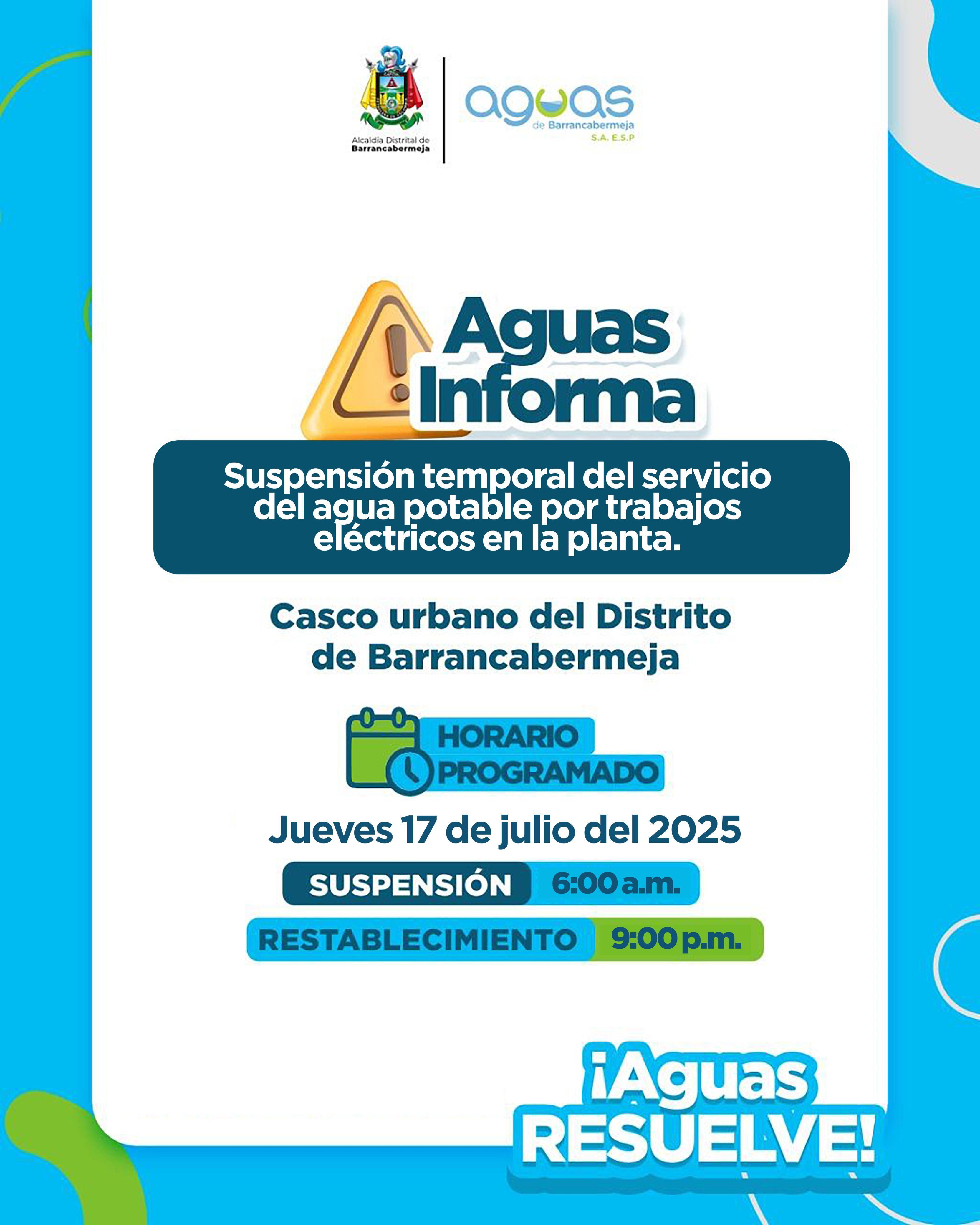 La Alcaldía de Barrancabermeja y la empresa Aguas de Barrancabermeja anunciaron que este jueves, 17 de julio, se realizará una parada programada de la planta de tratamiento de agua potable, lo que implicará la suspensión total del servicio en el área urbana del distrito durante 15 horas, entre las 6:00 de la mañana y las 9:00 de la noche.