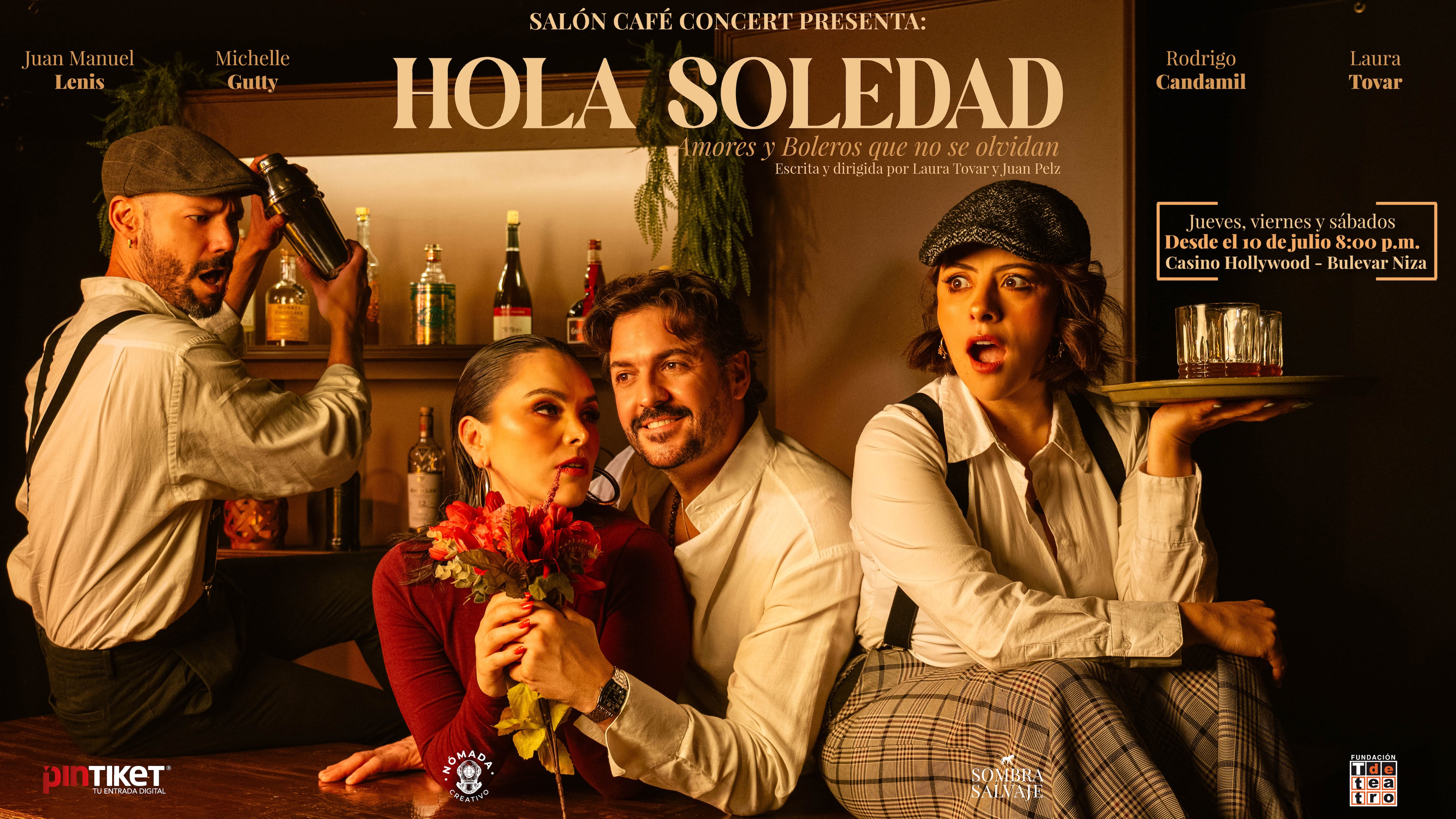 Esta producción de T de Teatro, Sombra Salvaje y Nómada Creativo la protagonizan Rodrigo Candamil (Silvio), Michelle Gutty (Carlota), Laura Tovar (Rita) y Juan Manuel Lenis (Cris). “Hola Soledad” presenta formato de teatro musical integrado por cuatro actores y cantantes, que interpretan cada una de las canciones del repertorio en vivo, la puesta en escena está en temporada los jueves, viernes y sábados en el teatro del Casino Hollywood De Bulevar Niza. Las entradas están disponibles en pintiket.com.