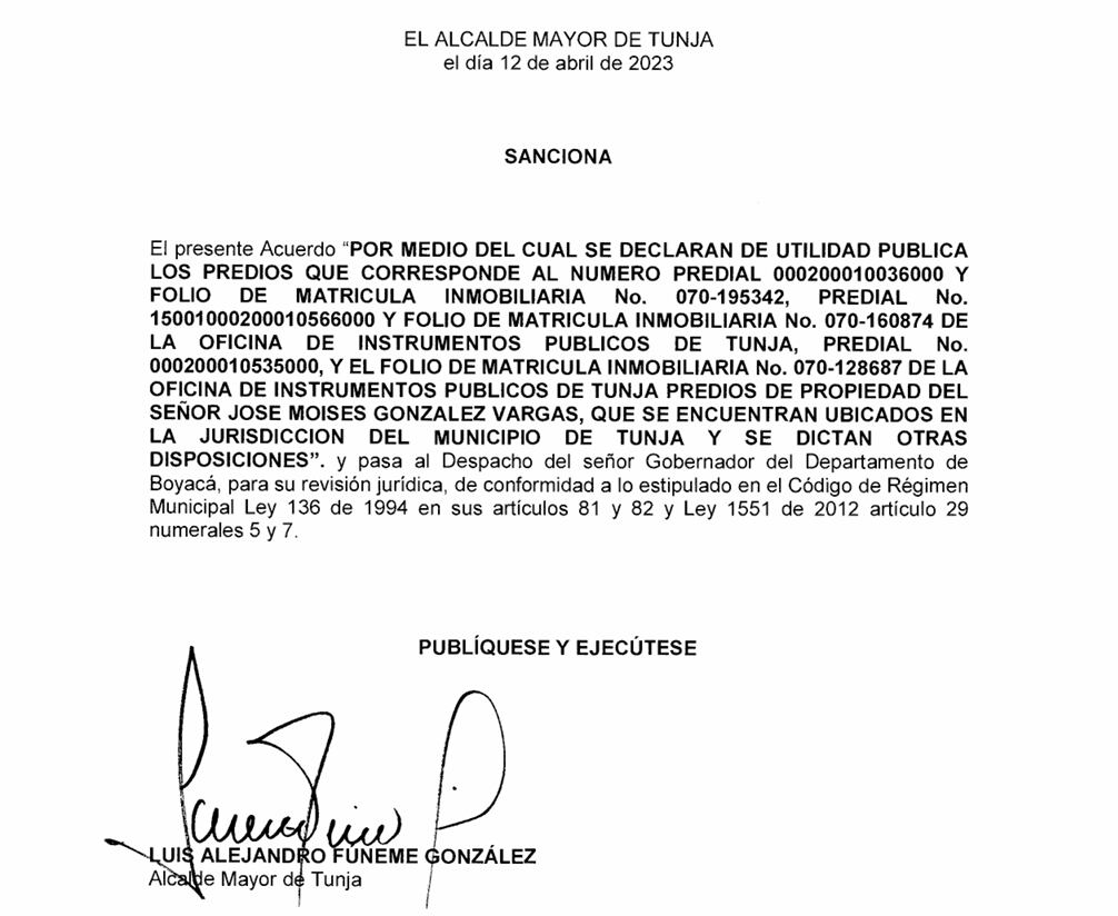 El Juzgado Once Administrativo Oral del Circuito de Tunja anuló por completo el Acuerdo Municipal 006 del 12 de abril del 2023. En ese acuerdo, el Concejo de Tunja había declarado como de utilidad pública tres terrenos ubicados en la vereda Chorro Blanco, con el fin de adquirirlos y construir allí la planta de beneficio animal. Sin embargo, el juez concluyó que esos terrenos no cumplían con una condición fundamental: el uso de suelo industrial.
