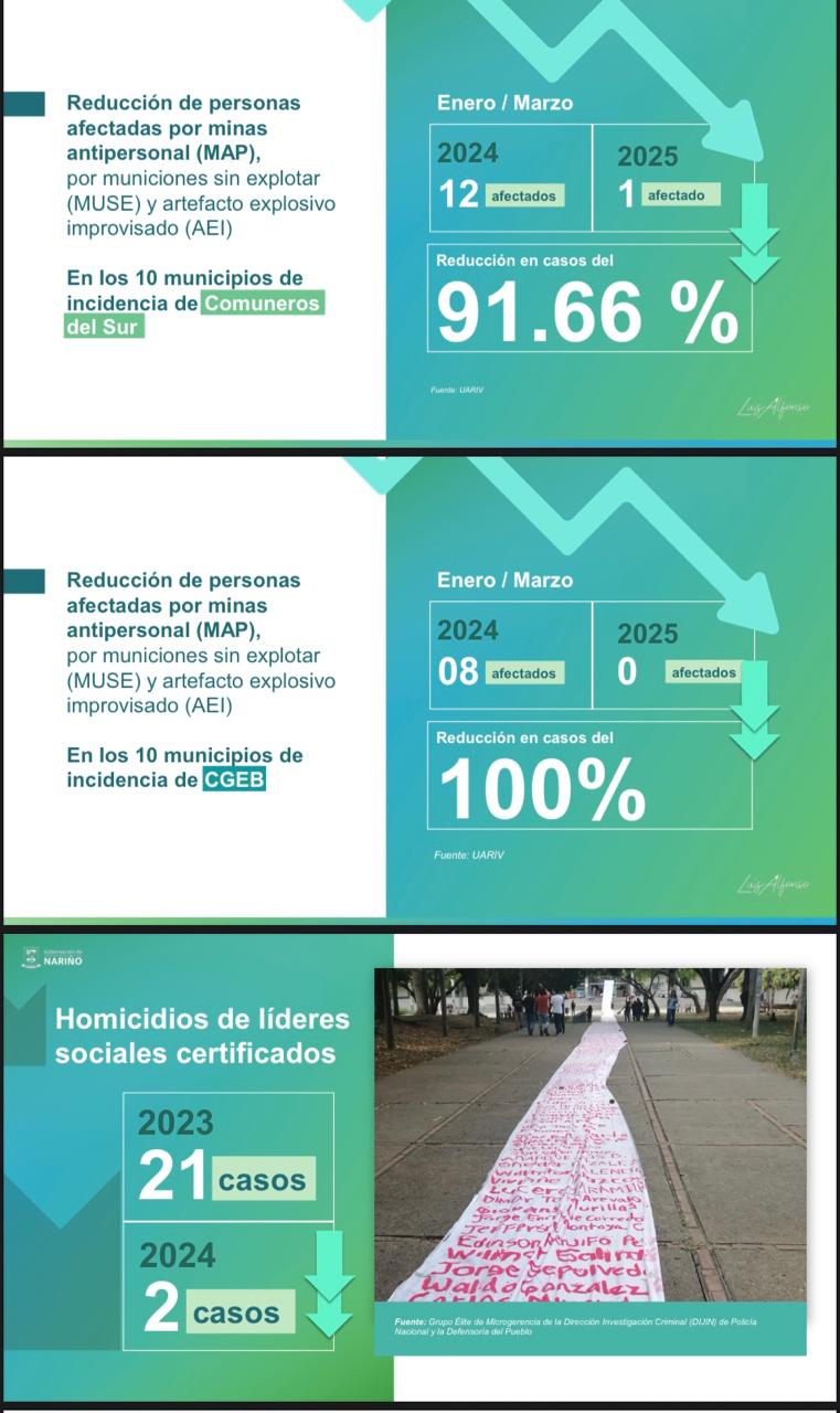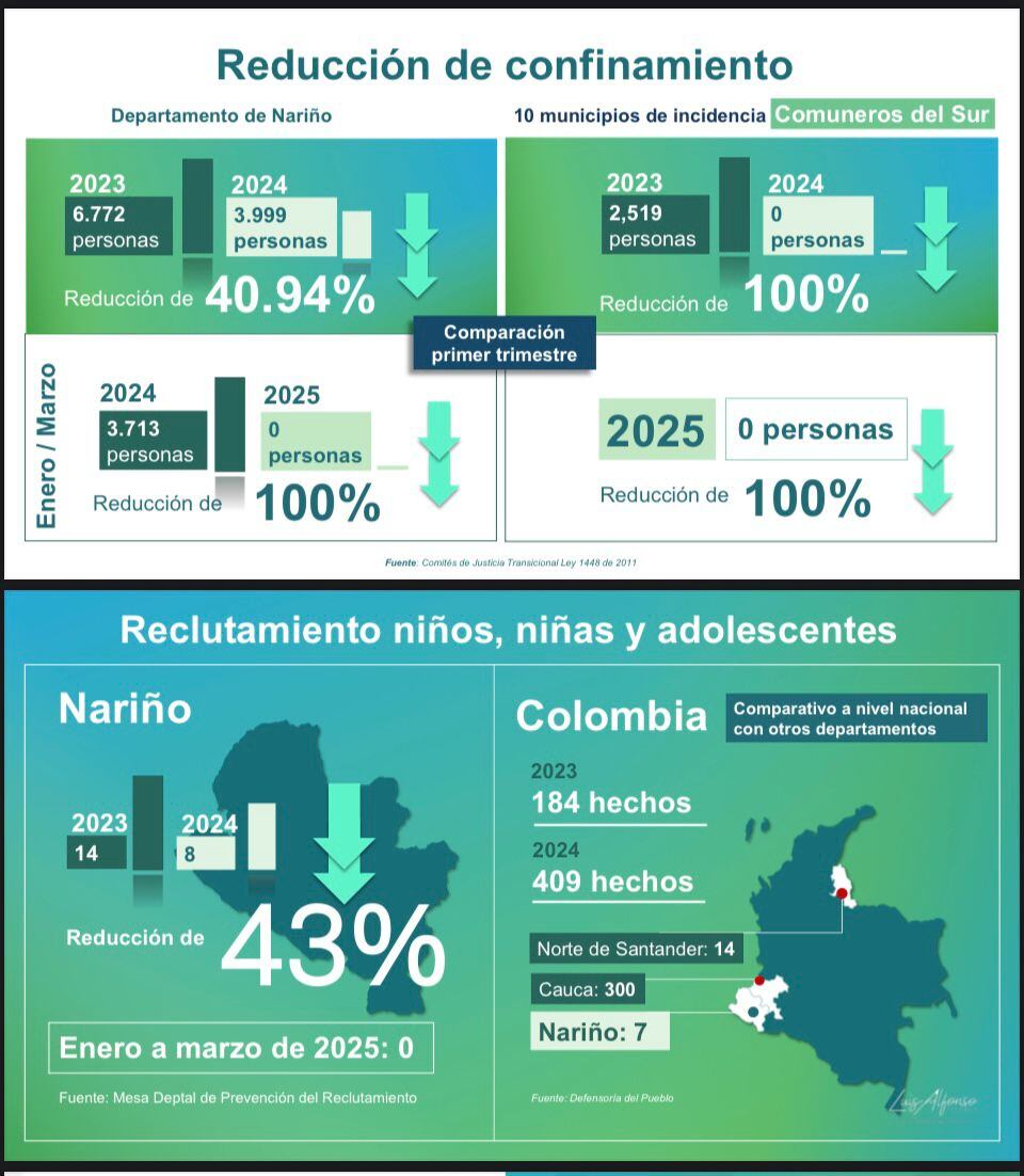 Otras cifras son: cero casos de confinamiento y reclutamiento de menores en el primer trimestre de 2025, reducción del 100% en homicidios de líderes sociales certificados y un 68% en homicidios en el contexto del conflicto armado.