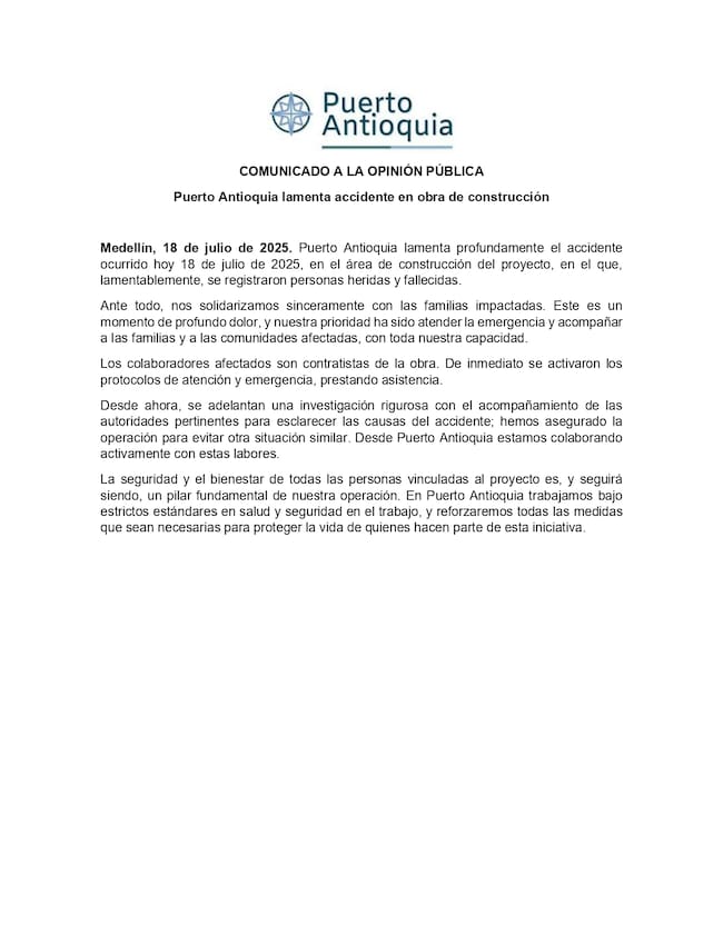 “Desde ahora, se adelanta una investigación rigurosa con el acompañamiento de las autoridades pertinentes para esclarecer las causas del accidente; hemos asegurado la operación para evitar situación similar. Desde Puerto Antioquia estamos colaborando activamente con estas labores”, agregó.