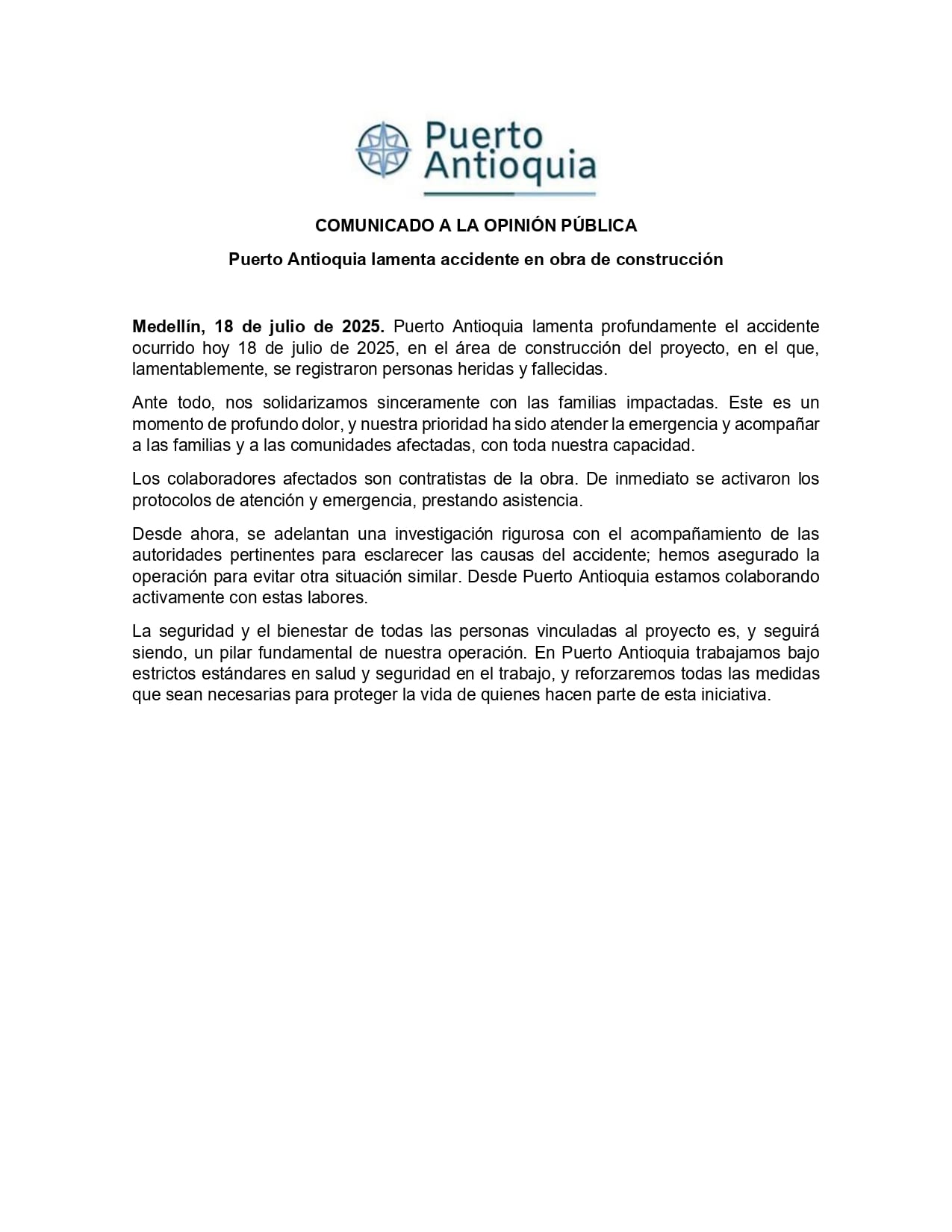 Comunicado accidente Puerto Antioquia