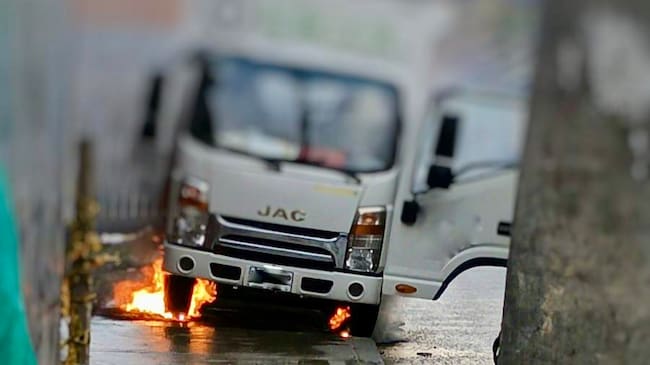 Furgón se incendia tras caída de cable de alta tensión en el centro de Bogotá