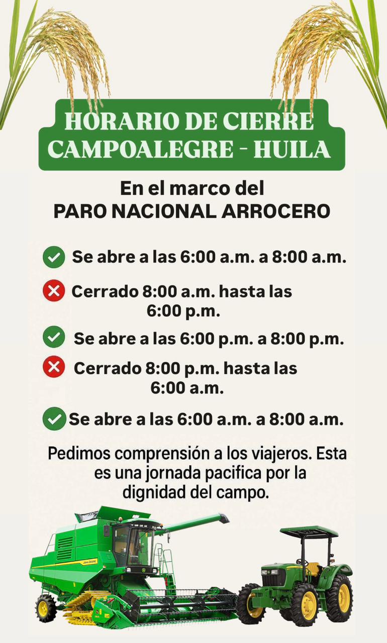 De acuerdo con lo expresado por Alcy Cortés, líder de dignidad arrocera, por el Huila, luego del fallido intento de inicio de las mesas de concertación, con el gobierno nacional, los productores arroceros asentados en los diferentes puntos decidieron aumentar el horario de los bloqueos en cada uno de los sectores. Según el nuevo panorama, los bloqueos se realizarán durante 10 horas seguidas, realizándose solo la apertura de cada vía por dos horas. Según esto, se aperturarán las vías de 6 a 8 de la mañana y de 6 a 8 de la noche.